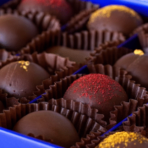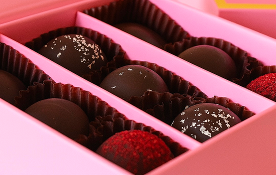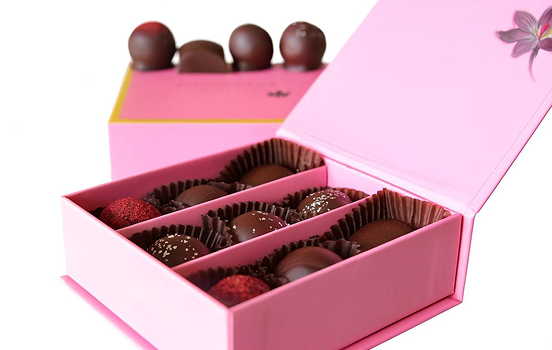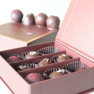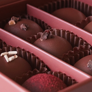 • Raspberry in a duet of milk and dark chocolate — a bright ruby accent.