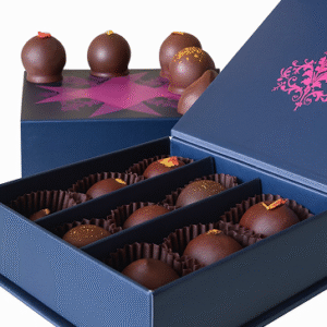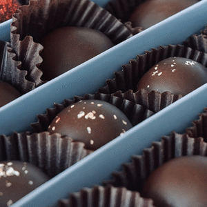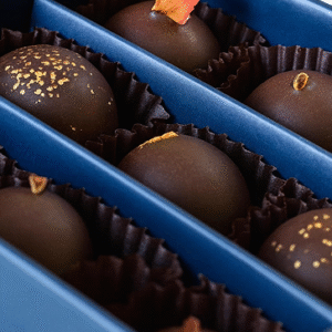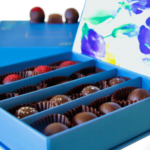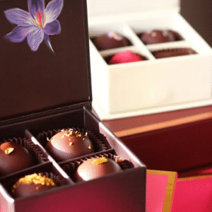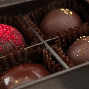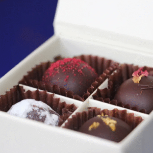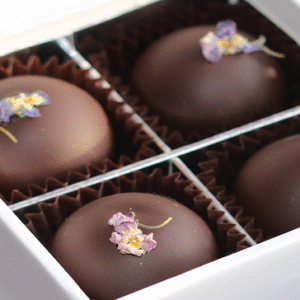Fino de Aroma chocolate, whole milk cream, butter, alcohol. Raspberry, strawberry , jasmine blossoms, matcha tea, edible silver, bergamot tea. Soy lecithin.